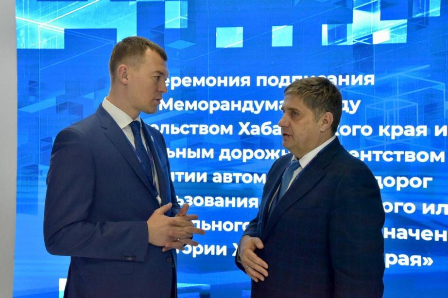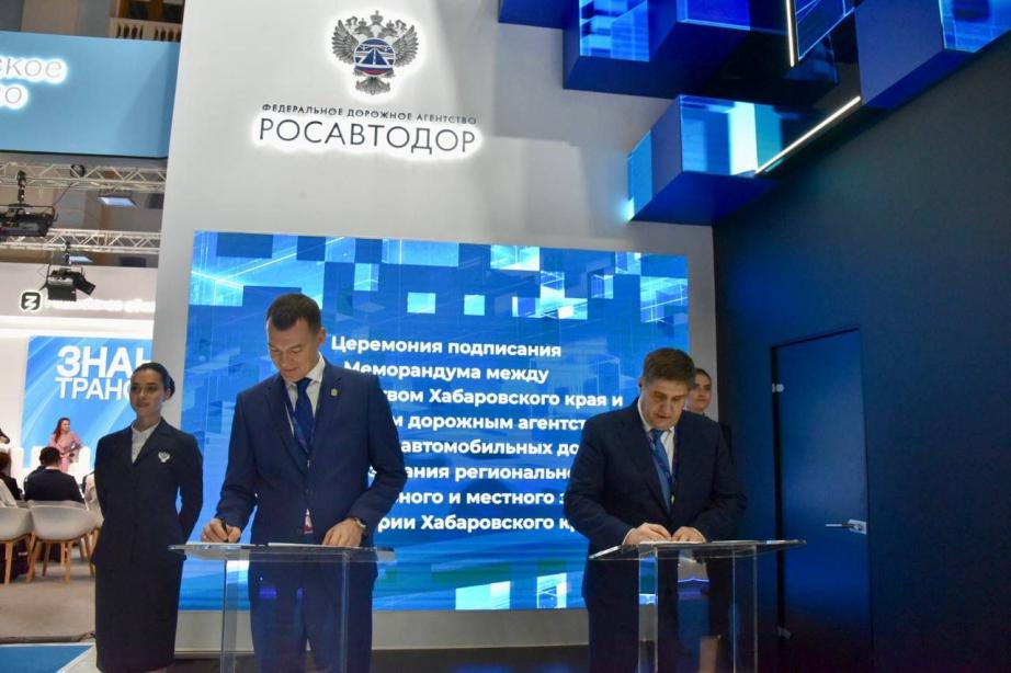 На полях XVI Международного форума «Транспорт России» губернатор Михаил Дегтярев и руководитель федерального дорожного агентства Роман Новиков подписали меморандум о развитии автодорог на территории Хабаровского края в ближайшие пять лет.